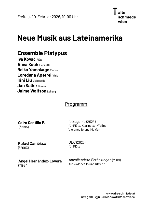 Ziel der langjährigen Kooperation der Musikwerkstatt mit dem Platypus Ensemble ist die Unterstützung junger Komponist*innen. Für dieses Programm mit Werken verschiedener Besetzung (von Solo bis Quintett) wurden eigenständige Positionen aus Lateinamerika ausgewählt, zum Teil auch mit Bezug zu aktuellen Szenen in Europa – zusammengestellt von Jaime Wolfson, dem Leiter des Ensembles.