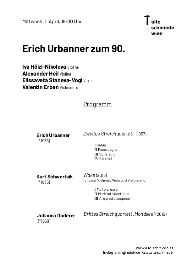 Ein Programm zu Erich Urbanners 90. Geburtstag mit dem 2. und 3. Streichquartett (1957/1971), mit Werken ehemaliger Schüler*innen (Uraufführung von Wolfgang Hölzl) und seines ebenfalls 90-jährigen Kollegen aus der Schiske-Kompositionsklasse, Kurt Schwertsik. Urbanners Werk zeichnet sich durch eine Überfülle klanglicher Ereignisse aus, die Instrumentalist*innen ein virtuos differenziertes Spiel abverlangen. Sein Stil wurzelt im strukturellen Denken der Zweiten Wiener Schule sowie teils in den nachfolgenden seriellen Konzepten und zeigt Gespür für ausbalancierte Form und prägnante Stimmführung.