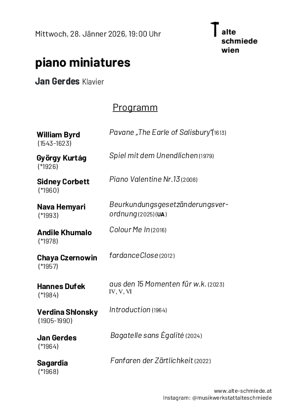 Jan Gerdes realisiert interdisziplinäre Projekte, Performance-Lectures, Kompositionen und bildnerische Arbeiten. In Auseinandersetzung mit der Fragmentierung und Beschleunigung unseres Alltags nimmt sein Projekt piano miniatures die kleine Form ins Visier: In Skizzen und Impulsen, in Blick, Wort oder Stimmung spiegelt sich dabei das große Ganze. Die engmaschig miteinander verwobenen Miniaturen werden außerdem durch Werke von Wiener Komponist*innen ergänzt.