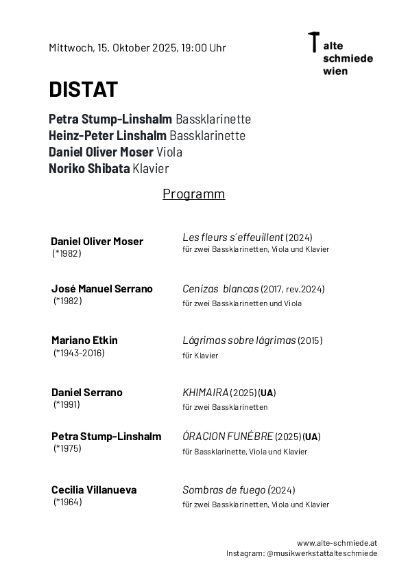 Zeitgenössische Werke argentinischer, spanischer und österreichischer Komponist*innen, darunter mehrere Uraufführungen und österreichische Erstaufführungen, stehen auf dem Programm. Entstanden ist es im Rahmen eines künstlerischen Austauschs mit dem »Distat Terra« in Patagonien, einem biennalen Festival für unabhängige Neue Musik in Lateinamerika. Nun wir das Programm zum ersten Mal in Europa präsentiert - ein Einblick in eine lebendige internationale Zusammenarbeit.