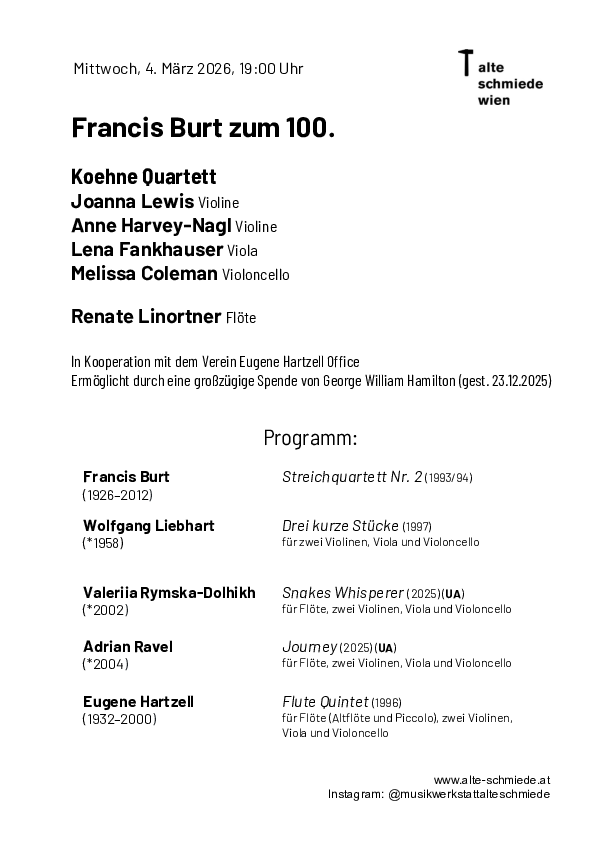 Francis Burt (geb. 1926 in London, gest. 2012 in Hartberg/Stmk.) wirkte als Komponist und Lehrer überwiegend in Wien. Sein Werk steht in der expressionistischen Tradition und kreist um den sich frei entfaltenden Klang, bei zugleich starker melodischer Führung. Teil des Programms ist das Flute Quintet des US-amerikanisch-österreichischen Komponisten Eugene Hartzell, das trotz dodekaphonischer Strenge Leichtigkeit entfaltet, Drei kurze Stücke des Burt-Schülers Wolfgang Liebhart und neue Werke der jungen Komponist*innen Valeriia Rymska-Dolhikh und Adrian Ravel.