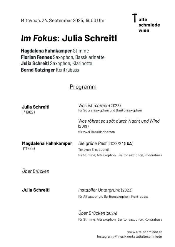 Julia Schreitl (*1982 im Weinviertel) studierte klassisches Saxophon und Jazz-Saxophon sowie Komposition in Wien und Schweden. Ihre jazzbasierte, übernationale Tonsprache nimmt auf Traditionen des populären Musizierens Bezug. Ein Schwerpunkt liegt auf interdisziplinären Projekten. Die an diesem Abend uraufgeführten Werke haben ihre Genese in Texten zur politischen, ökologischen und wirtschaftlichen Unsicherheit der Gegenwart.