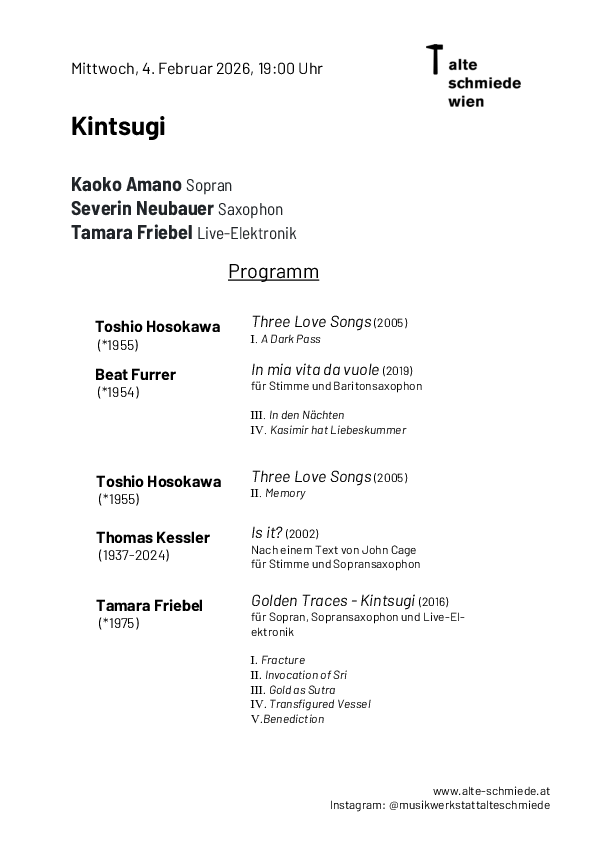 Kintsugi ist die japanische Handwerkskunst, zerbrochenes Porzellan mit Goldlack zu kitten. Anstatt die Schäden zu verstecken, werden sie betont. Dieses Bild und seine Poetik ist der Ausgangspunkt des Duo-Projekts, das auf Brüche, Spuren und deren Transformation zielt. Teil des Programms sind außerdem neue Werke mit Elektronik von Kaoko Amano und Tamara Friebel, die sich mit dem ›Weben‹ als Dialog-Metapher befassen.