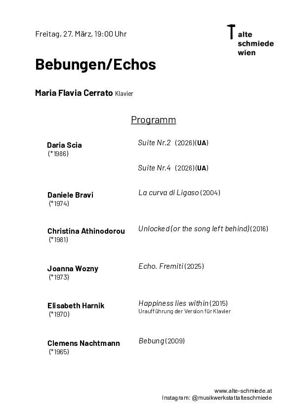 Maria Flavia Cerrato ist Mitglied des Schallfeld Ensembles und studierte u.a. Performance Practice in Contemporary Music. Das Programm wurde 2025 in Graz präsentiert und umfasst Uraufführungen von Joanna Wozny, Daria Scia und Elisabeth Harnik sowie Clemens Nachtmanns Komposition Bebung, die Triller, Tremoli und Tonrepetitionen nicht als Verzierung, sondern als Material behandelt. Eigens für dieses Konzert schrieb Daria Scia ein Werk, das Manipulationen im Inneren des Instruments resonieren lässt.