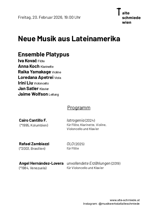 Ziel der langjährigen Kooperation der Musikwerkstatt mit dem Platypus Ensemble ist die Unterstützung junger Komponist*innen. Für dieses Programm mit Werken verschiedener Besetzung (von Solo bis Quintett) wurden eigenständige Positionen aus Lateinamerika ausgewählt, zum Teil auch mit Bezug zu aktuellen Szenen in Europa – zusammengestellt von Jaime Wolfson, dem Leiter des Ensembles.