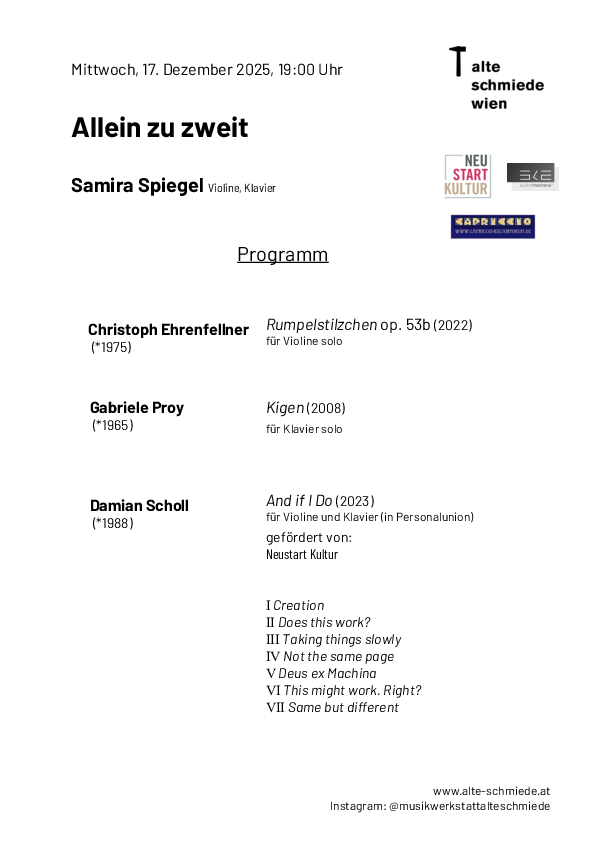 Die Multiinstrumentalistin Samira Spiegel ist in der klassischen und in der zeitgenössischen Musik zuhause. Im Rahmen ihres künstlerischen Doktoratsstudiums entwickelte sie die Idee, als One-Woman-Band aufzutreten. Digitale Technologien sowie Komponist*innen unterstützen sie bei der Umsetzung. Zugleich sind Solowerke für ihre zwei Hauptinstrumente selbstverständlich Teil ihrs Repertoires. Zur Uraufführung gelangt ein neues Werk von Tomasz Skweres für Klavier.