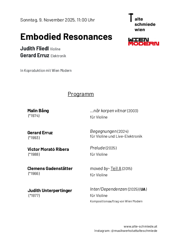Judith Fliedl geht in einem Forschungsprojekt den Wechselwirkungen zwischen aufführenden Musiker*innen und Publikum nach. Im Zentrum dieses Programms steht das gemeinsame Erleben von Klängen, geprägt von Faktoren wie Raum, Situation, Perspektive und körperlicher Präsenz. Im Rahmen dieses Projekts haben Komponist*innen Stücke für die Interpretin Judith Fliedl geschrieben – einige davon sind an diesem Abend zu hören.