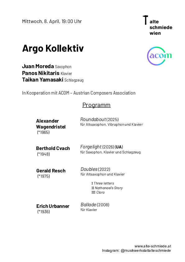 Die Austrian Composers Association veranstaltet zweimal jährlich einen »Call for Scores«, bei dem seine über 700 Mitglieder eingeladen sind, Werke zur Aufführung einzureichen bzw. Konzerte zu kuratieren. Für dieses Konzert fungiert das junge Argo Kollektiv in seiner Stammbesetzung als Ensemble-in-Residence. Neben ausgewählten Einreichungen ist das große Klavierwerk Ballade von Erich Urbanner zu hören (siehe Konzert am 1.4.).