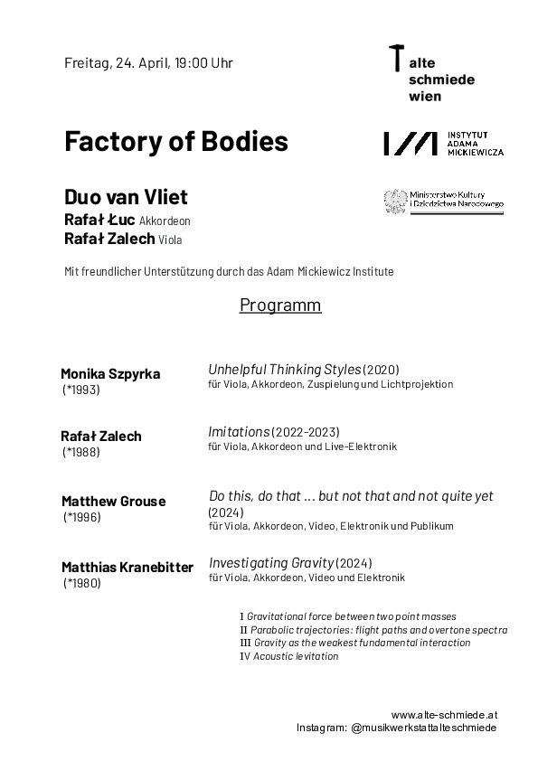 Rafał Zalech lebt als Komponist und Entwickler elektronischer Erweiterungen für Instrumente in Wien. Mit Rafał Łuc verbindet ihn das Interesse für experimentelle Formen, die Instrumente durch Elektronik und Video erweitern. An diesem Abend legt das Duo den Fokus auf polnische Komponist*innen: Die Werke lassen sich im mitteleuropäischen ›Neuen Konzeptualismus‹ verorten und erweitern das Bühnengeschehen medial und durch Interventionen des Publikums.