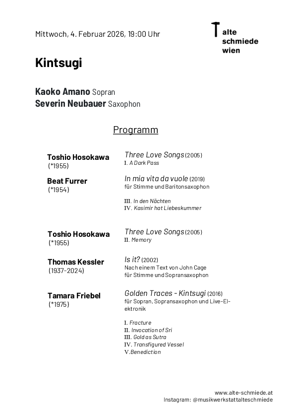 Kintsugi ist die japanische Handwerkskunst, zerbrochenes Porzellan mit Goldlack zu kitten. Anstatt die Schäden zu verstecken, werden sie betont. Dieses Bild und seine Poetik ist der Ausgangspunkt des Duo-Projekts, das auf Brüche, Spuren und deren Transformation zielt. Teil des Programms sind außerdem neue Werke mit Elektronik von Kaoko Amano und Tamara Friebel, die sich mit dem ›Weben‹ als Dialog-Metapher befassen.